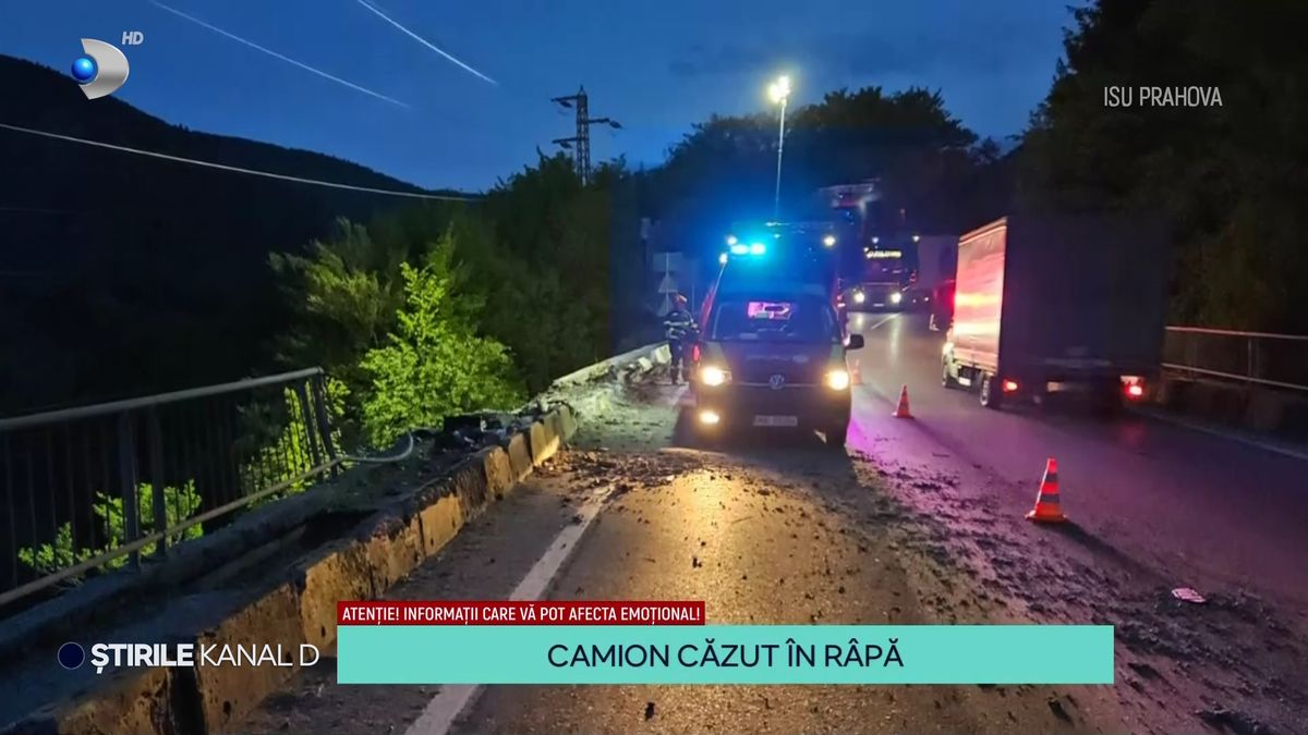 „Accident grav petrecut, în această dimineață, la Sinaia. Un tir încărcat cu produse alimentare a căzut în gol mai bine de 100 de metri, într-o râpă adâncă.