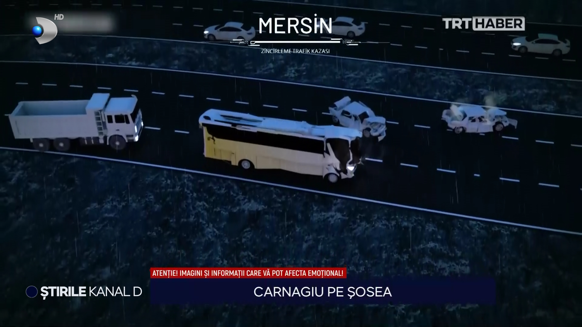 „Carnagiu pe o șosea din Turcia! 11 persoane au murit și alte 30 au fost rănite în urma impactului dintre un autocar, un camion și două autoturisme. De vină ar fi fost șoferul autocarului, care a intrat pe contrasens, unde s-a izbit de cele două mașini și de un camion. 9 dintre răniți sunt în stare gravă, iar autoritățile anchetează acum cauzele tragediei”, a transmis Christian Sabbagh.