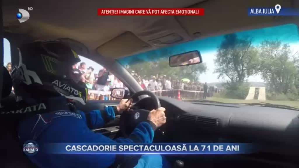 Imagini incredibile au fost surprinse în Alba Iulia, acolo unde un cascador de 71 de ani a zburat cu mașina câțiva metri în aer.