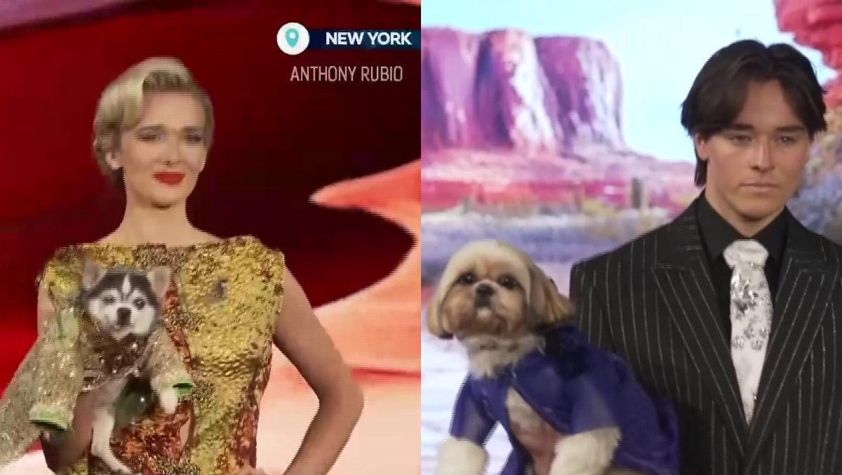 „În minutele următoare vă arătăm imagini de la o prezentare de modă... altfel. De data aceasta, alături de modele prezente la Săptămâna Modei de la New York. Pe podium au defilat mai mulți căței îmbrăcați în ținute asortate”.