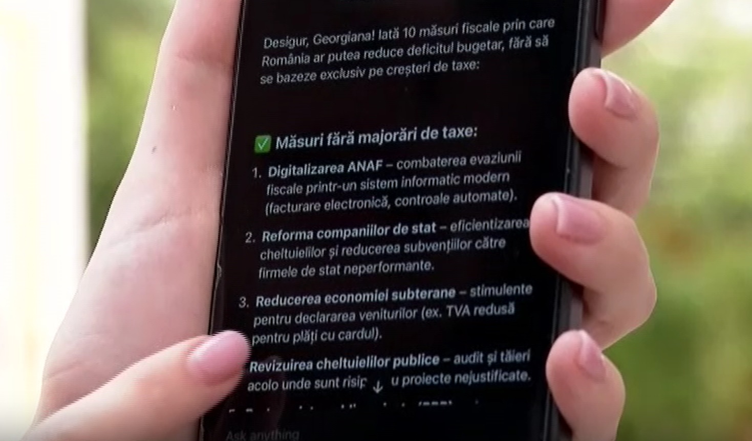 De reducerea cheltuielilor partidele vorbesc prea puțin. Subiectele principale sunt creșterea TVA, impozitarea pensiilor sau controversata taxă de solidaritate, adusă în discuție de un social democrat care ia bani de chirie de la stat deși are proprietăți în Capitală: „Tocmai de aia nu mai suntem în țară, plecăm de aici. Acum m-am întors, acum zece minute, din Norvegia”. Iar omul de rând e îndreptățit să fie revoltat, drept dovadă întrebăm inteligența artificială ce ar trebui să facă guvernul româniei ca să reducă deficitul bugetar și să evite o criză economică de proporții.