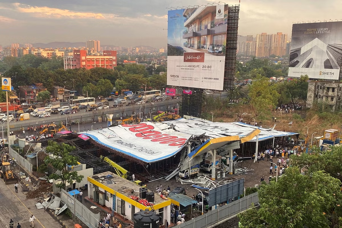 Panoul publicitar stradal, care măsoară 70 m în lungime și 50 m înălțime, a căzut peste o stație de combustibil și peste câteva case din zona Ghatkopar din Mumbai.