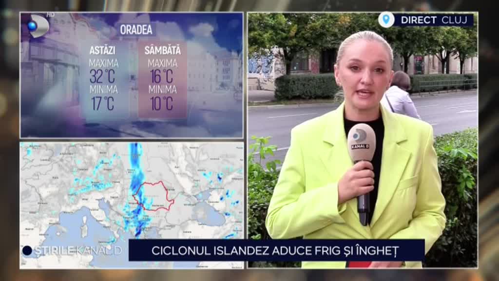 De exemplu în Oradea de la o maximă de 32 de grade, cât a fost azi, sâmbătă se vor înregistra doar 16 grade. Și la Cluj temperaturile vor scădea în weekend de la 29 de grade, la doar 16 grade Celsius.
