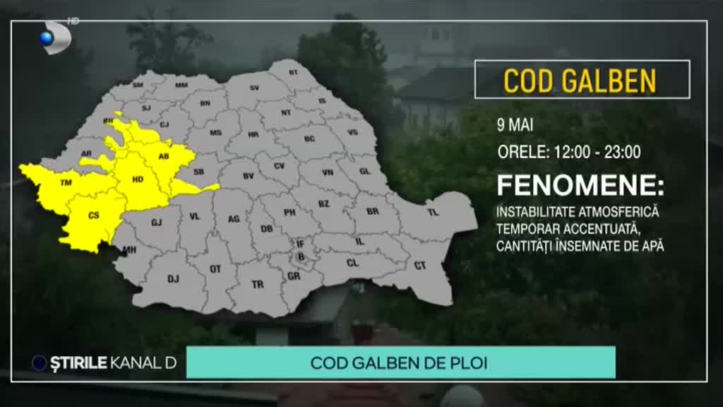 Cantitățile de apă acumulate în urma ploilor pot atinge izolat peste 40 de l/mp. Cod galben este valabil până diseară la ora 23, a transmis Simona Pătruleasa.