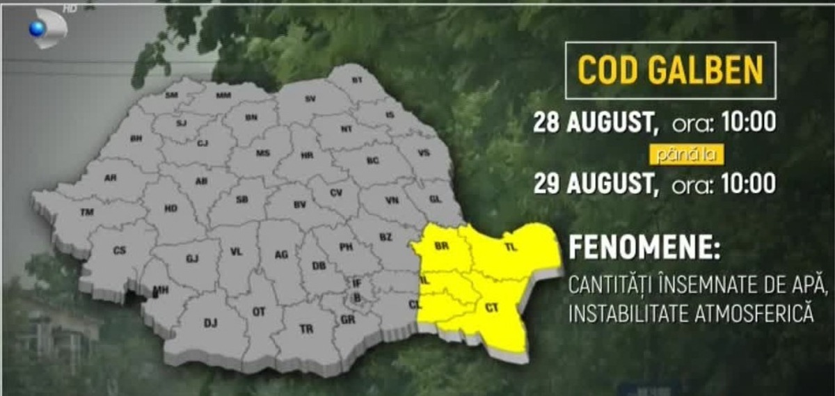 „Astăzi, ploile se mută în Dobrogea și estul Munteniei. Meteorologii au emis o atențioare cod galben de averse, intensificări ale vântului și descărcări electrice ce vizează aceste zone. Aici, cantitățile de apă vor ajunge chiar și la 40 de litri/metru pătrat, iar vântul va sufla cu 55 de kilometri/oră. Codul galben este valabil până mâine dimineață, la ora 10”, a spus Simona Pătruleasa.