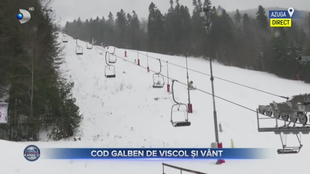 Viscolul deja a creat probleme. Noi suntem la Azuga, iar aici instalațiile de transport pe cablu au fost oprite vedeți în spatele meu. Teleschiul, telescaunul este oprit la fel se întâmplă și cu telegondoala de aici din Azuga care a fost oprită din cauza vântului puternic. Sunt probleme asemănătoare și-n alte stațiuni de pe Valea Prahovei. De exemplu, la Sinaia, domeniul schiabil este complet închis la cota două mii.