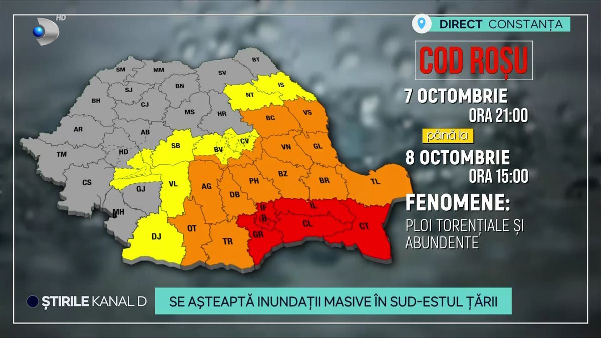 România se pregătește să înfrunte o perioadă dificilă din cauza condițiilor meteo extreme. Începând din această seară, un cod roșu de ploi torențiale intră în vigoare în București, în județul Constanța, dar și în alte patru județe: Călărași, Ialomița, Giurgiu și Ilfov. Autoritățile avertizează asupra riscului de inundații masive și au luat măsuri urgente pentru a limita efectele potopului.
