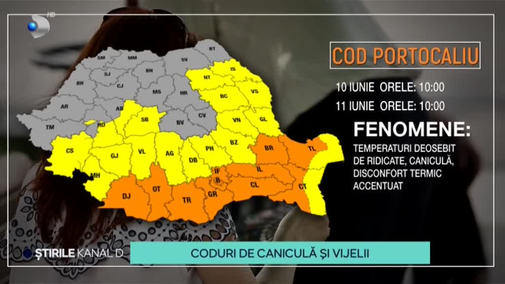 „Vremea ne aduce atât caniculă, cât și ploi însoțite de vijelii. Astfel că, meteorologii au emis o avertizare cod galben de caniculă pentru: Moldova, nordul Olteniei și al Munteniei, sud-estul Transilvaniei, sudul Banatului și pe litoral, unde se vor înregistra maxime între 30 și 34 de grade. Acest cod este valabil de astăzi până mâine dimineață. Tot în același interval va fi valabil și un cod portocaliu de caniculă, ce vizează alte zone din sud. Aici, temperaturile vor urca până la 37 de grade, iar disconfortul termic va fi accentuat. Tot pentru astăzi, dar începând cu ora 15, meteorologii au emis un cod portocaliu de ploi și vijelii pentru Banat, Crișana, Maramureș, cea mai mare parte a Transilvaniei și jumătatea de nord a Moldovei, precum și zona montană.