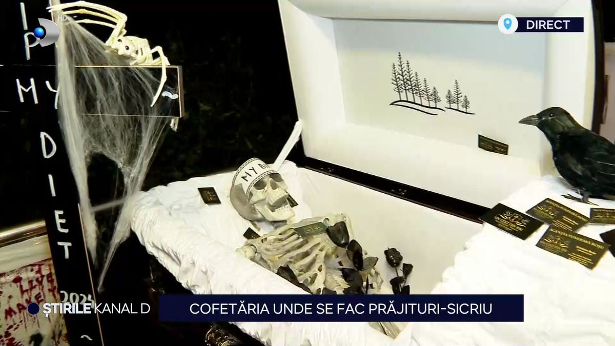 „Astă-seara e Halloweenul, cea mai înfricoșătoare noapte din an, iar localurile se întrec în decoruri care să le dea oaspeților fiori pe șira spinării. Colega mea, Gabriela Ghizel, este chiar acum la o cofetărie unde s-au strâns zeci de persoane să guste din prăjiturile sicriu”, a spus Cosmin Cernat.