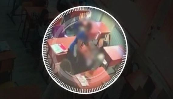 El încearcă să riposteze, dar se trezește sub o altă ploaie de pumni și picioare. Mai grav este că la violențe profesoara asistă neputincioasă.
