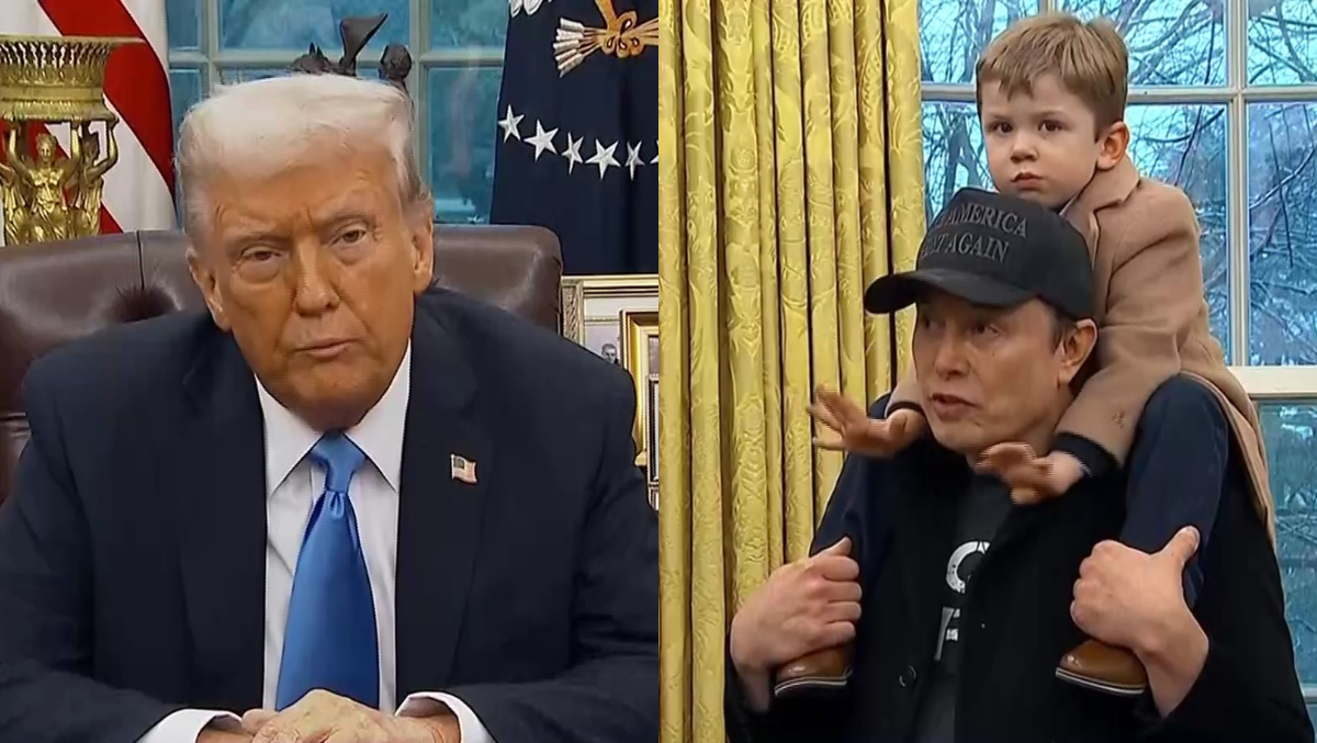 „Președintele Donald Trump a rămas hipnotizat de fiul lui Elon Musk, în timp ce copilul de patru ani a furat spectacolul la o conferință de presă din Biroul Oval. De pe umerii tatălui său, micuțul năzdrăvan s-a ținut numai de giumbușlucuri, a râs și chiar i-a băgat degetele în urechi CEO-ului SpaceX”.