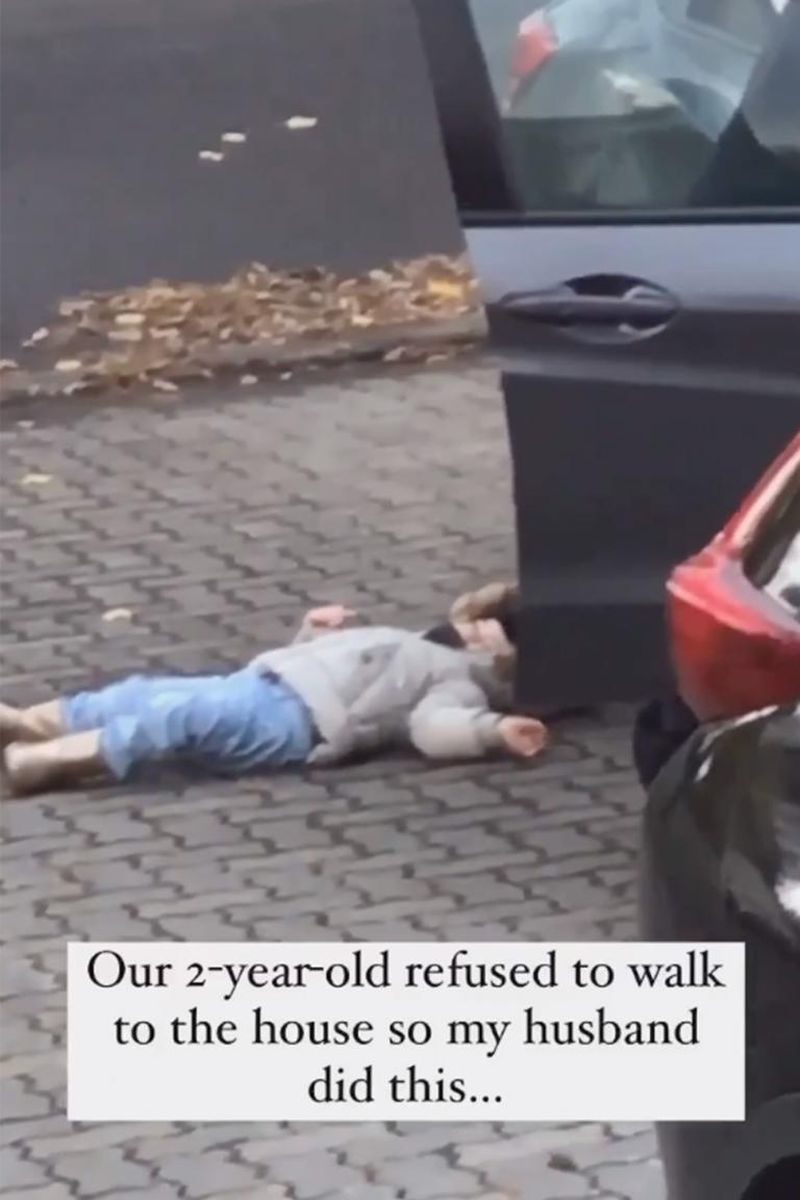 "Copilul nostru de doi ani a refuzat să meargă pe jos spre casă”, a subtitrat mama clipului. „Deci soțul meu a făcut asta…”