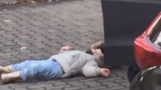 În timp ce tatăl ia plasele cu alimente din mașină, copilul poate fi văzut întins pe pământ în spatele vehiculului, fără a mișca niciun mușchi.