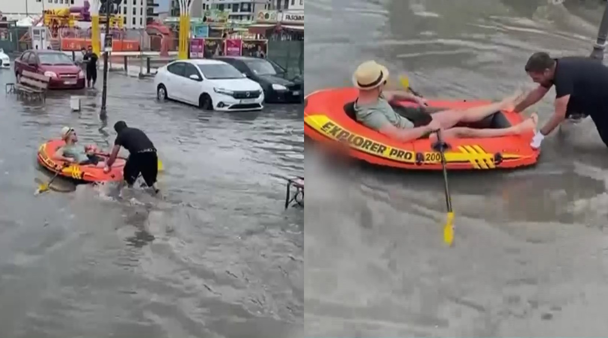 „Chiar dacă furtunile au fost violente, un turist din Mamaia Nord a făcut haz de necaz după ce a văzut că aleile din stațiune s-au inundat până la genunchi. A scos barca și a ieșit să se plimbe.
