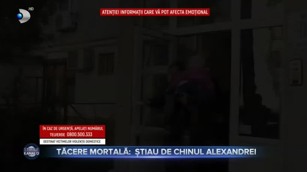 În fața camerelor, nici mama, nici cumnata acesteia, nu au scos niciun cuvânt. Tot tăcerea a fost unul dintre motivele care au dus la moartea Alexandrei. Copila de 9 ani era chinuită demult, spun anchetatorii. Era bătută frecvent, iar despre abuzuri știau și unchiul și mătușa cu care locuia. Vecinii au auzit și ei de multe ori țipete de durere. Se pare că femeia obișnuia chiar să se filmeze când o bătea.