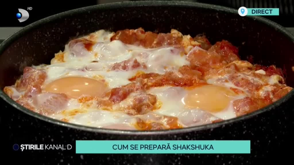 „Ați gustat vreodată shakshuka? Este un fel de mâncare potrivit atât pentru micul-dejun, cât și pentru prânz. La bază sunt ouăle, dar și legumele proaspete. Colega mea, Ellvira Costache, se află chiar acum în bucătăria unui restaurant și ne explică rețeta”, a spus Cristina Dorobanțu.