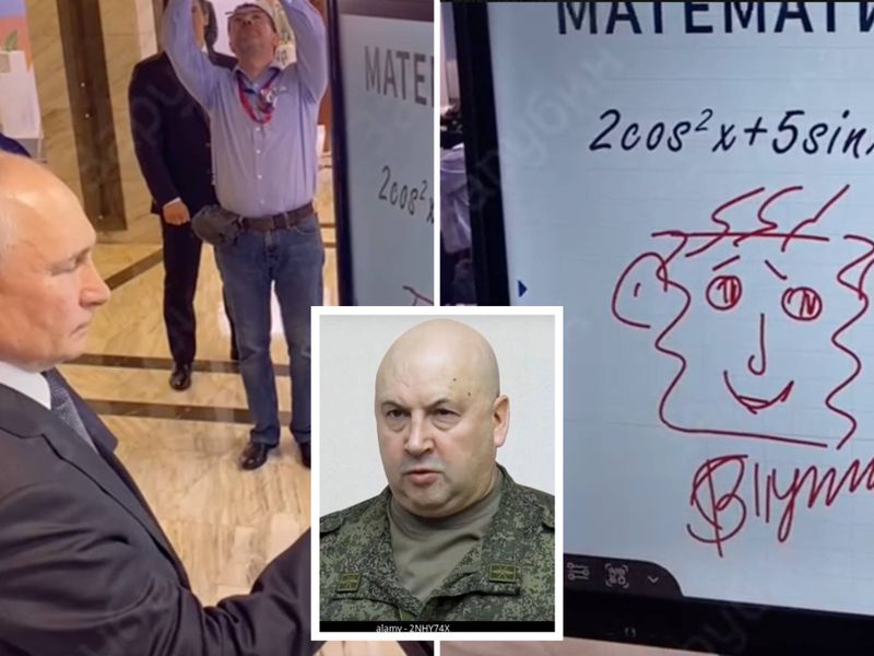 - În cadrul unei ore de matematică, stând în fața unei table interactive, în loc să rezolve o ecuație, Putin își lasă „opera de artă” personală ca un suvenir ambiguu amenințător și frustrat;
