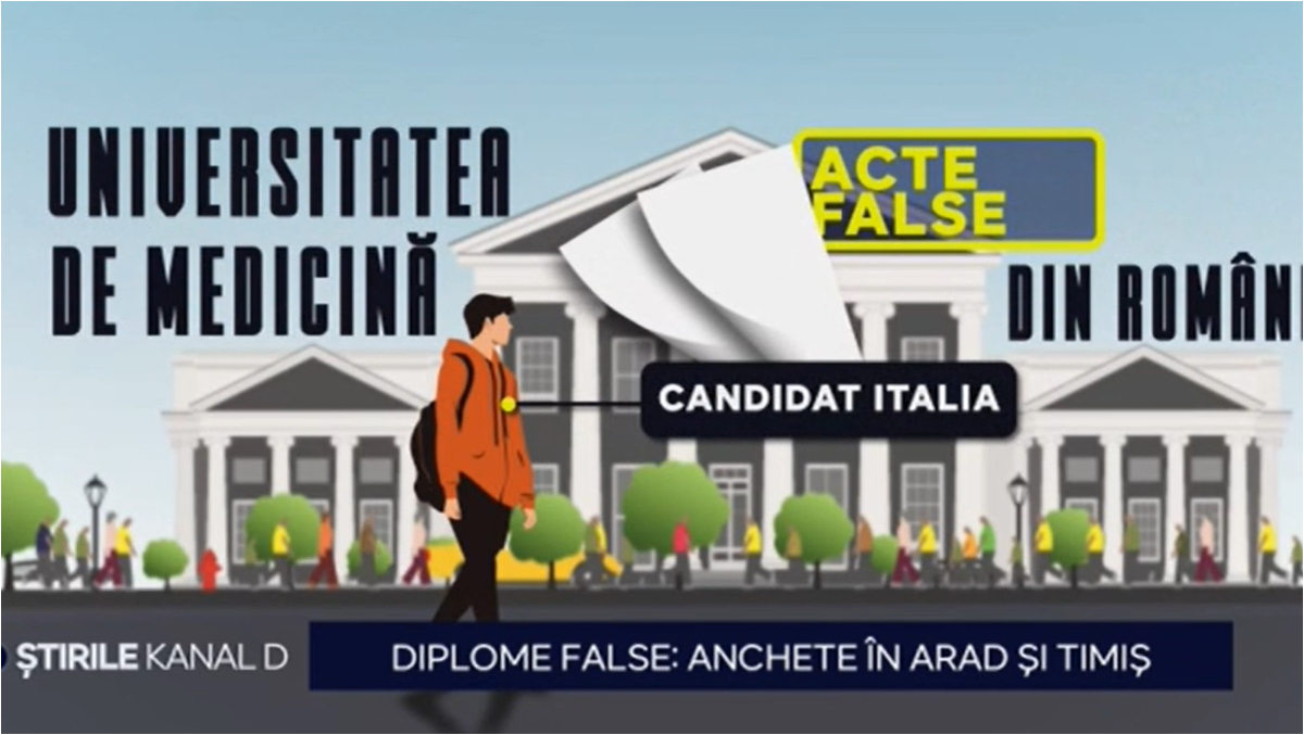 Jurnaliștii italieni de la Rai Tre au ajuns în România, la Timișoara și Arad. Ei susțin că au descoperit următoarea schemă: un candidat din Italia care nu reușește să intre la medicină în Peninsulă ar apela la acte false obținute de la o universitate din țara noastră.