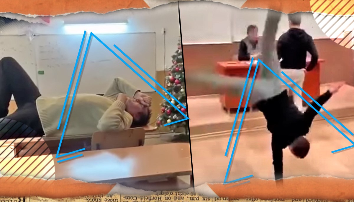 În cele două videoclipuri se poate observa cum elevii fac tumbe, iar profesorii stau întinși pe catedră. Ora de fizică pare să fie acum mult mai interesantă.