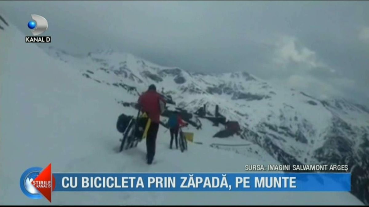 Doi turisti straini au fost filmati in timp ce mergeau cu bicicleta pe munte, prin zapada.