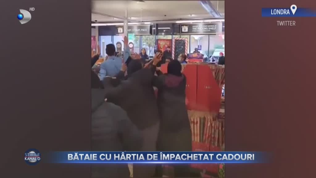 „Se încing spiritele înainte de Crăciun! Mai mulți clienți, înarmați cu suluri de hârtie pentru împachetat cadouri, au început să se lovească din senin într-un supermarket din Londra. Imaginile au devenit imediat virale pe internet”, a transmis Christian Sabbagh, prezentatorul Știrilor Kanal D.