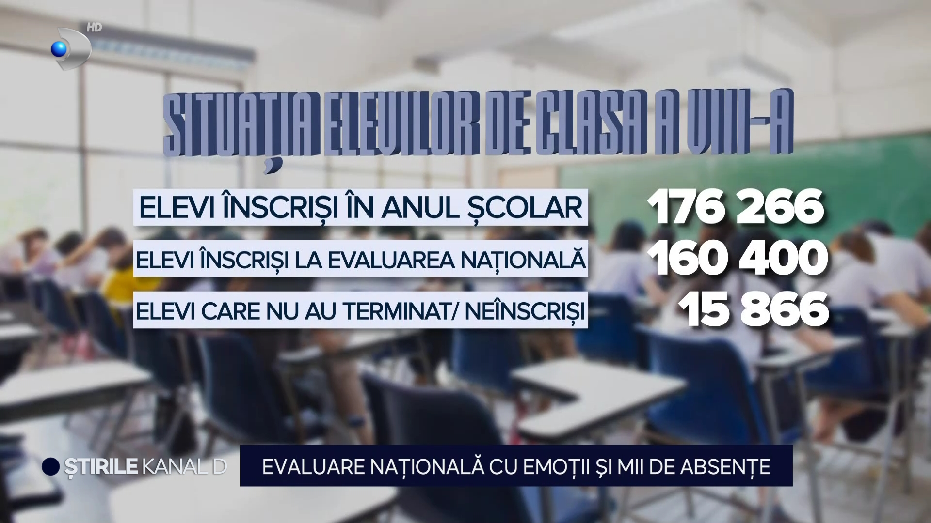 Conform datelor transmise de inspectoratelor școlare, 160.000 de absolvenți de clasa a8-a au fost înscriși la Evaluarea Națională. Totuși, datele de la Ministerul Educației arată că, la începutul anului școlar, erau peste 176.000 de elevi. Asta înseamnă că că mai bine de 15.000 de elevi fie nu au terminat clasa a8-a, fie nu au fost înscriși la examen din diferite motive.