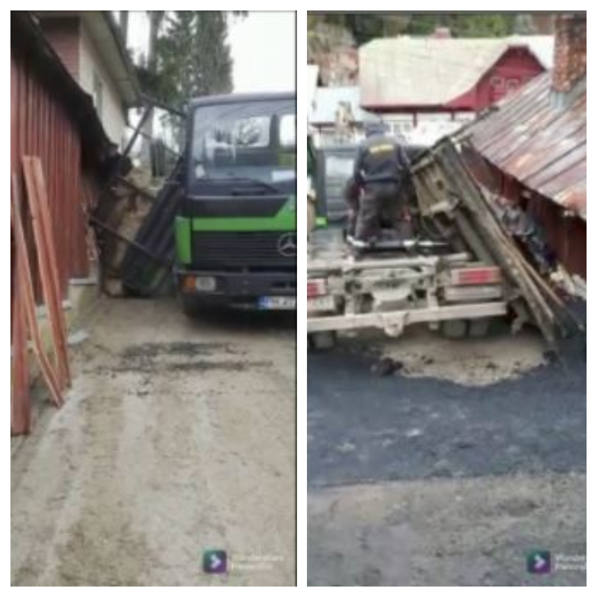 Totul s-a întâmplat după ce un camion s-a defectat, iar bena plină cu bitum și smoală a căzut peste zidul şi acoperişul casei. Doar norocul a făcut ca nimeni să nu fie rănit.