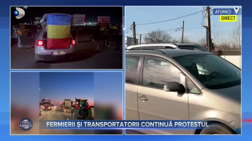 „Fermierii și transportatorii continuă protestul. De exemplu, la Afumați, în județul Ilfov încă sunt prezente camioane și utilaje pe DN2. Colega mea, Diana Buzea, se află acolo și ni se alătură cu detalii. Bună ziua, Diana, care mai este situația?”, a transmis Cristina Dorobanțu, prezentatorea Știrilor Kanal D.