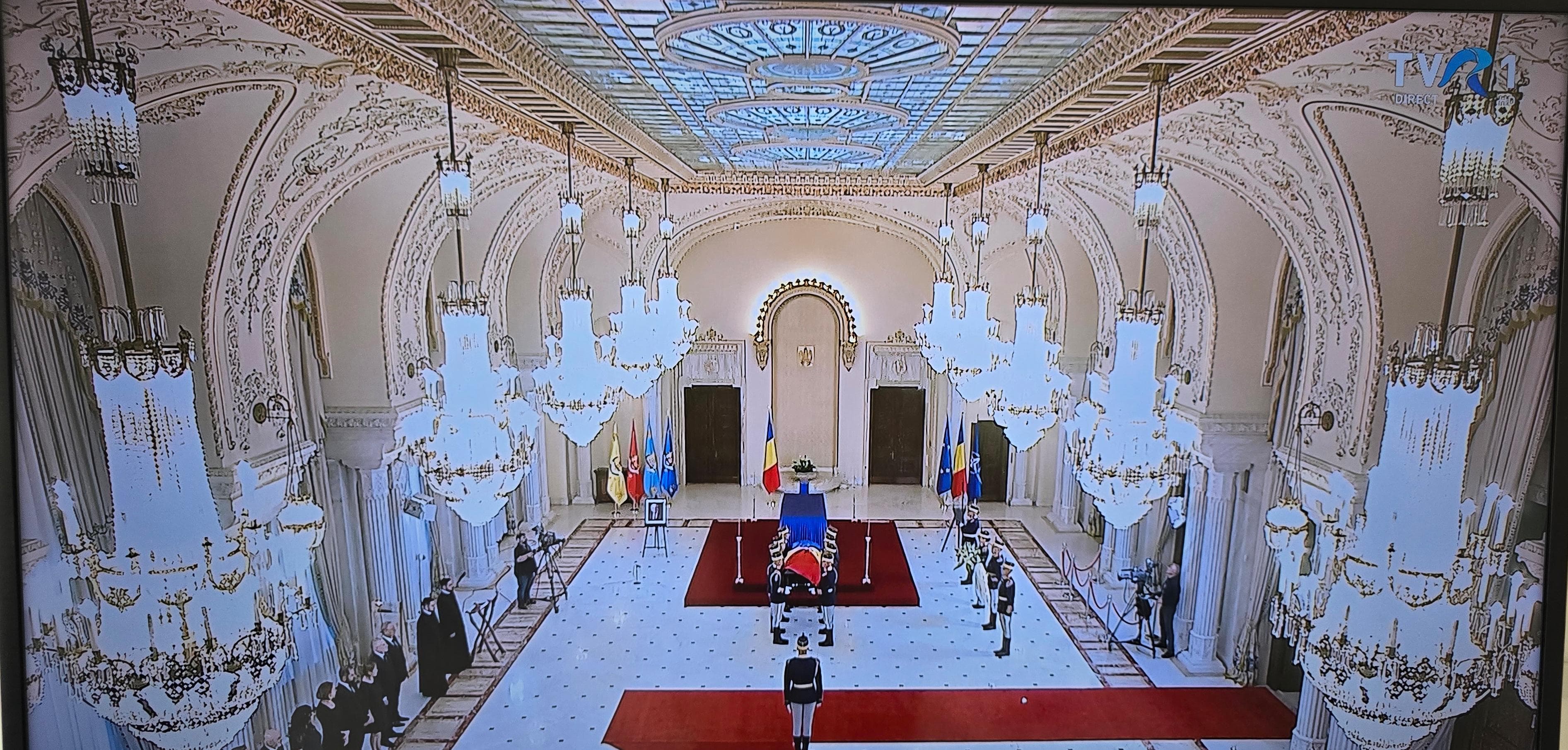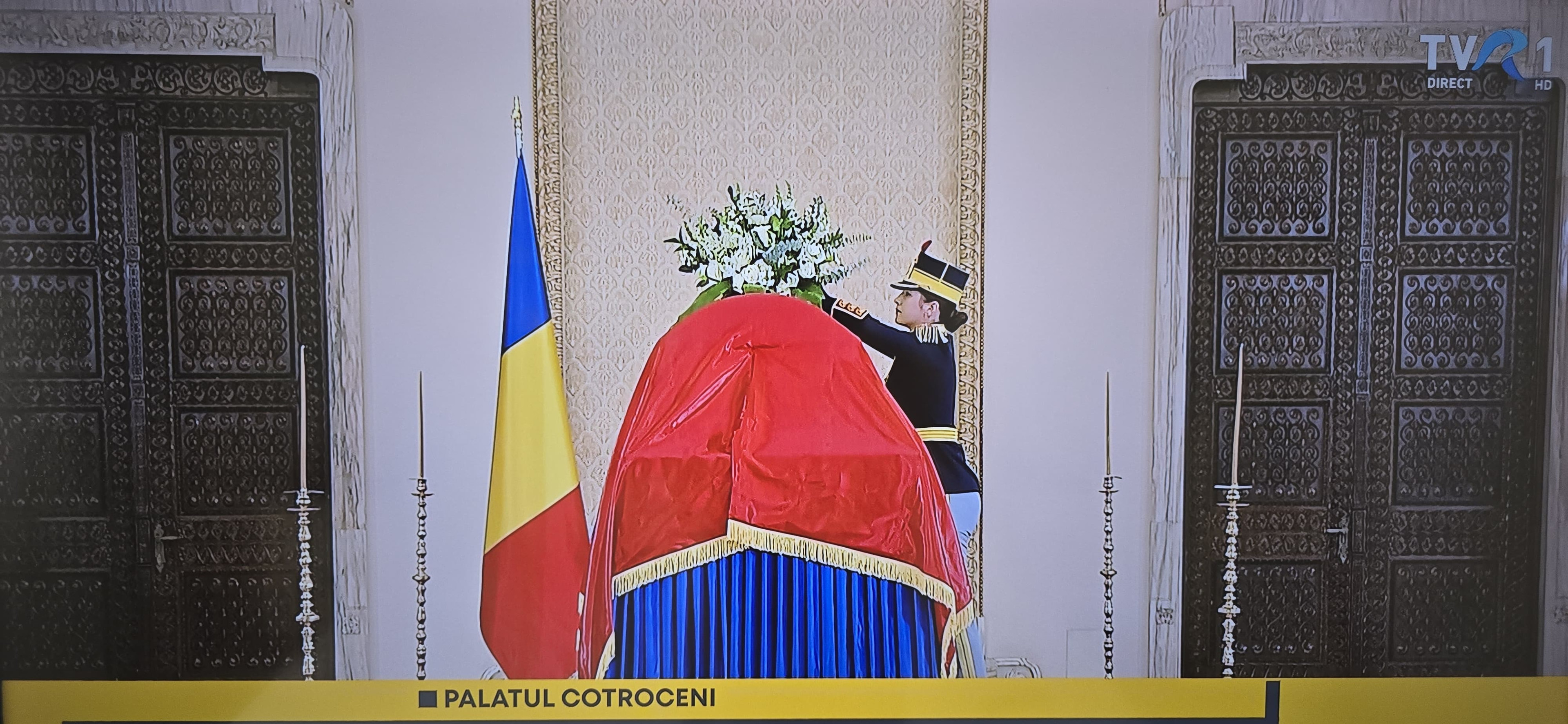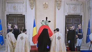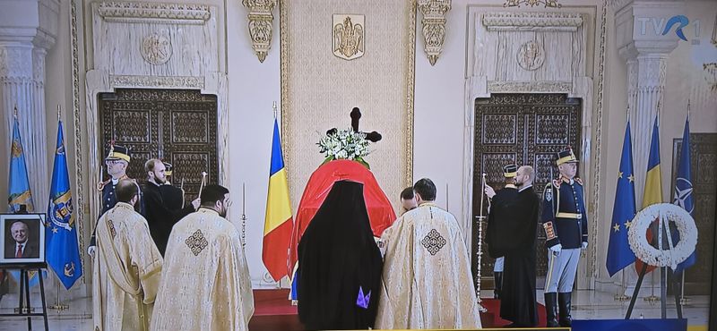 Opt militari ai Regimentului 30 Gardă "Mihai Viteazul" au dus pe brațe sicriul până în Sala unde a fost depus pe catafalc. A urmat apoi oficierea unei slujbe religioase.
