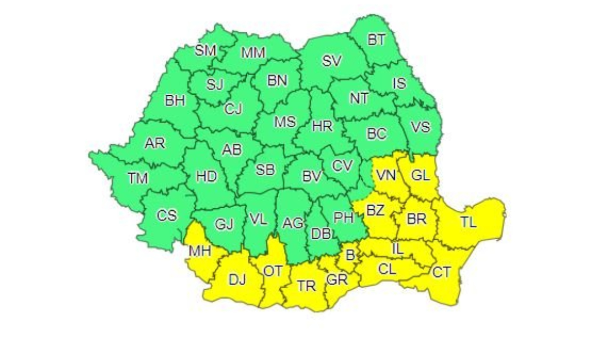 Meteorologii au emis în urmă cu scurt timp un nou cod galben de ploi torenţiale, vijelii şi grindină. Acesta va fi valabil în intervalul 27 iulie, ora 10:00- 27 iulie, 21:00.