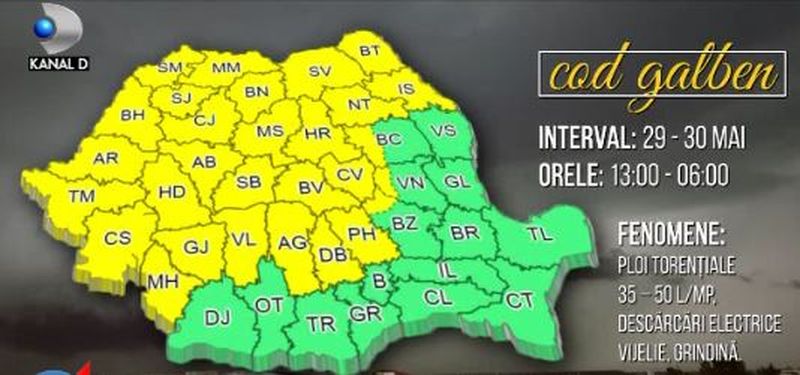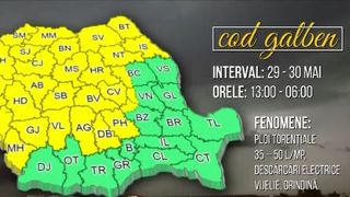 Astfel de vijelii scurte, dar intense vor lovi din nou cu putere 25 de judete din tara. Meteorologii au emis un cod galben de vreme rea: de astazi si pana sambata va ploua torential, cu grindina, vant si descarcari electrice, iar apa ar putea depasi 50 de litri pe metrul patrat.