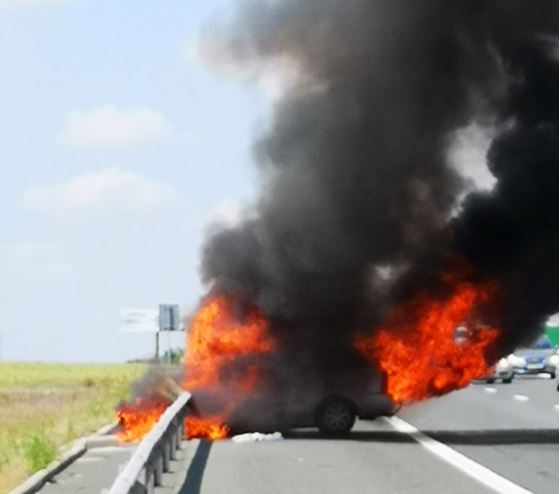 Din primele informații, o femeie a pierdut controlul volanului și autoturismul pe care îl conducea s-a lovit de parapetul marginal, spre banda de urgență și a luat foc.