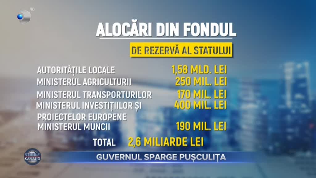 Dar, lista Guvernului a fost lungă, iar fondul de rezervă, parcă un sac fără fund. Ministerul Agriculturii a primit 250 de milioane de lei, iar Ministerul Investițiilor și Fondurilor Europene 400 de milioane de lei. Ministerul Transporturilor a fost finanțat cu 170 de milioane de lei, iar cel al Muncii cu 190 de milioane.