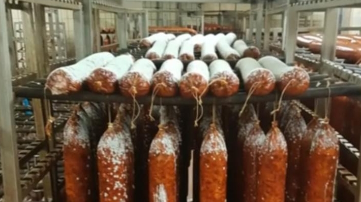 Camerele de supraveghere l-au surprins in flagrant in timp ce indesa salamurile din vitrine in plasa in timp ce vanzatoarea servea alt client.