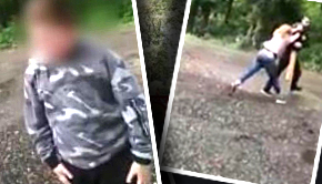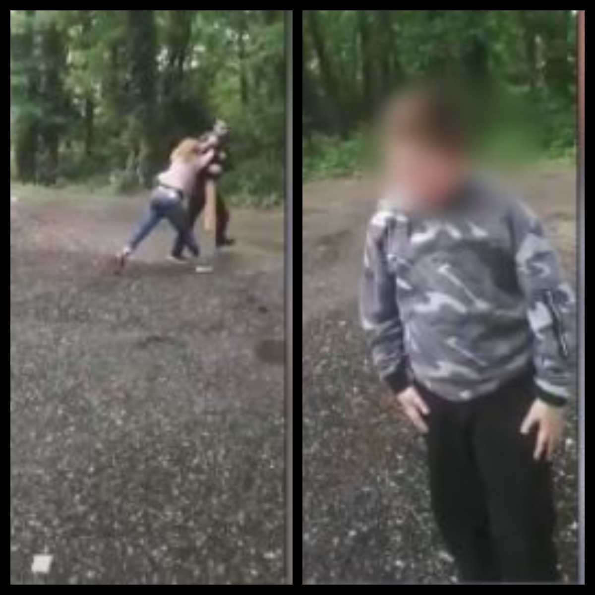 Cu toate astea, imaginile arată că tatăl extrem de agresiv nu vrea deloc să se oprească. Pune mâna pe o scândură din lemn și vine amenințător către minor, moment în care o femeie i se opune și începe să îl împingă.