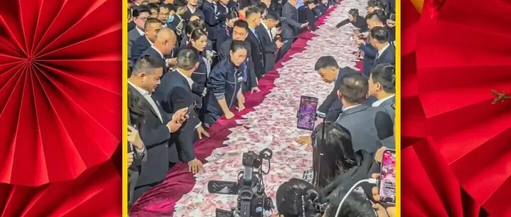 Peste 800 de mese de banchet au fost amenajate în interiorul locației, cu pachete de bani în valoare totală de peste 60 de milioane de yuani îngrămădite pe ele (7,7 milioane de euro).