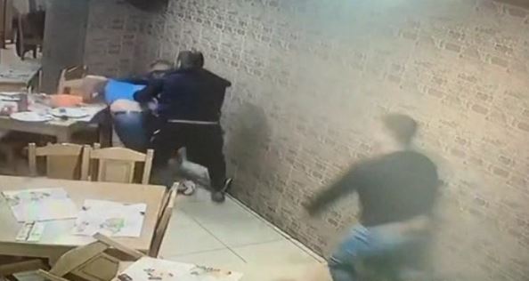 Discutia s-a aprins chiar in restaurant. Ca sa intimideze, individul in galben scoate de la brau un pistol si-l flutura amenintator. Tinta este omul in tricou albastru care se fereste de agresorii nervosi. La un moment dat, insa, e incoltit si atacat cu pumnii, apoi este lovit cu o teava. La fel si prietenul lui.