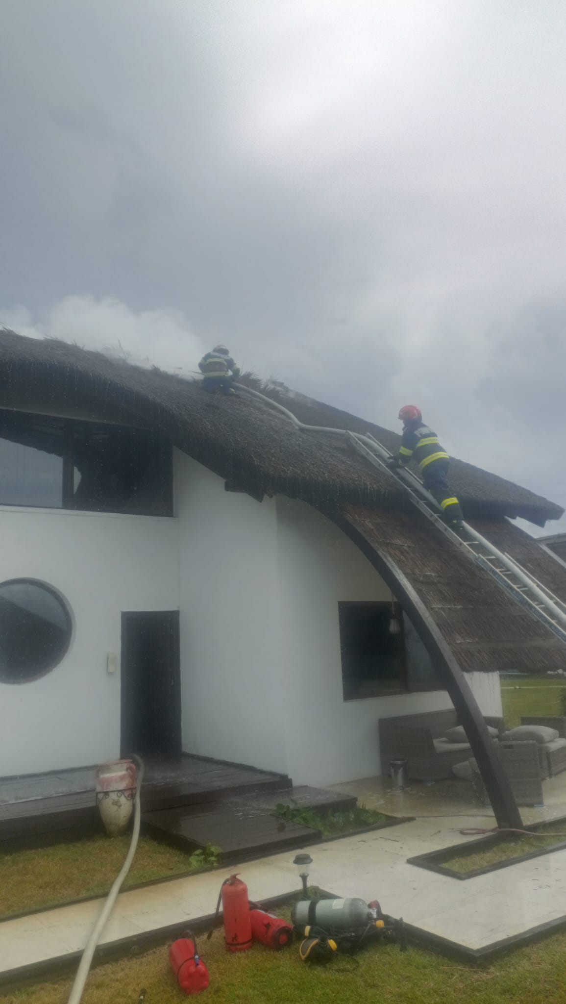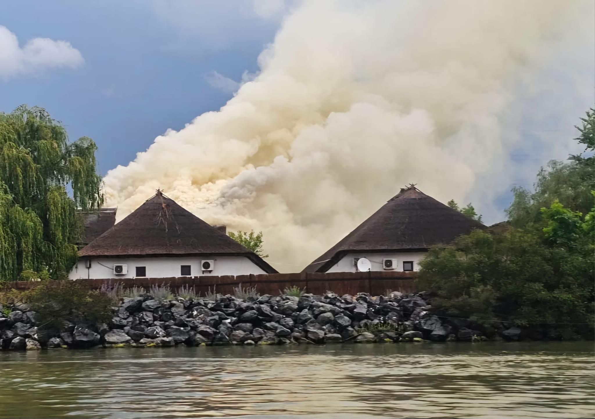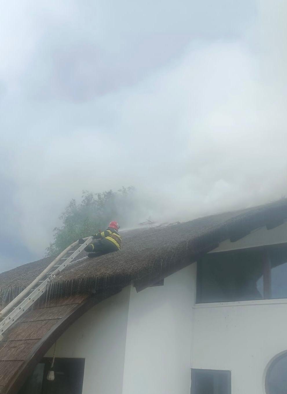 UPDATE: Potrivit pompierilor care au intervenit la stingerea incendiului, cauza acestuia a fost un fulger. Pentru că acoperișul clădirii era acoperit cu stuf exista riscul ca flăcările să se extindă cu repeziciune și să cuprindă întreaga clădire.