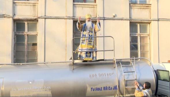 1 din 2 | VIDEO | ÎPS Teodosie s-a urcat și anul acesta pe cisternă pentru a sfinți apa în Ajun de Bobotează: „Aghiasma nu infectează, nu e periculoasă”