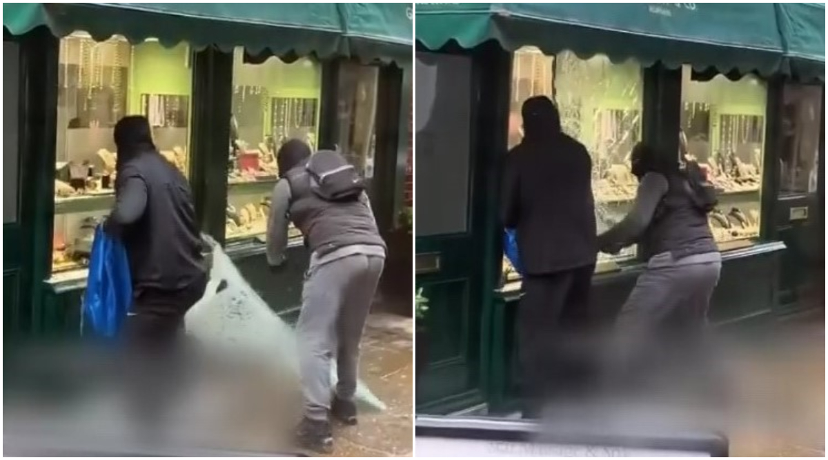 Incidentul a fost surprins pe filmări realizate chiar de martori, care au imortalizat momentul în care cei doi bărbați cu fețele acoperite cu cagulă au spart vitrina magazinului în doar câteva zeci de secunde.