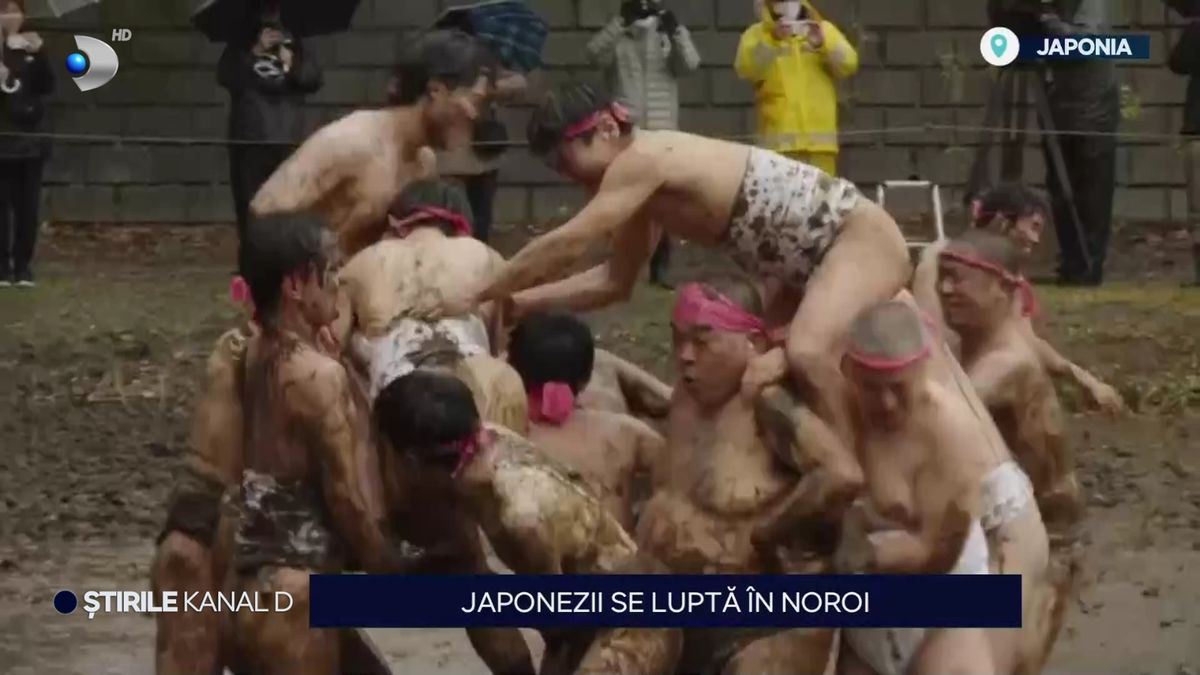 Imagini spectaculoase vin din Japonia, unde mai mulți bărbați îmbrăcați doar în șorturile tradiționale se luptă în noroi, formând piramide umane impresionante.