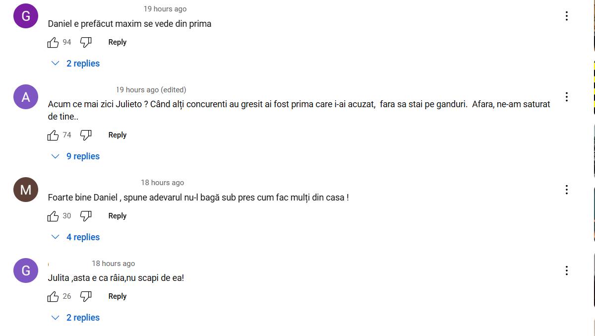 "Acum ce mai zici, Julieto? Când alți concurenți au greșit, tu ai fost prima care i-a acuzat, fără să stai o clipă pe gânduri! Afară! Ne-am săturat de tine", a completat un alt internaut.