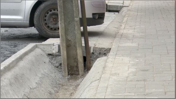 În această imagine există 2 probleme. Prima este evidentă: stâlpul din mijlocul șantului. A doua, lătimea acestui canal prin care ar trebui să curgă apa. Oamenii spun că o ploaie de scurtă durată îi și inundă.