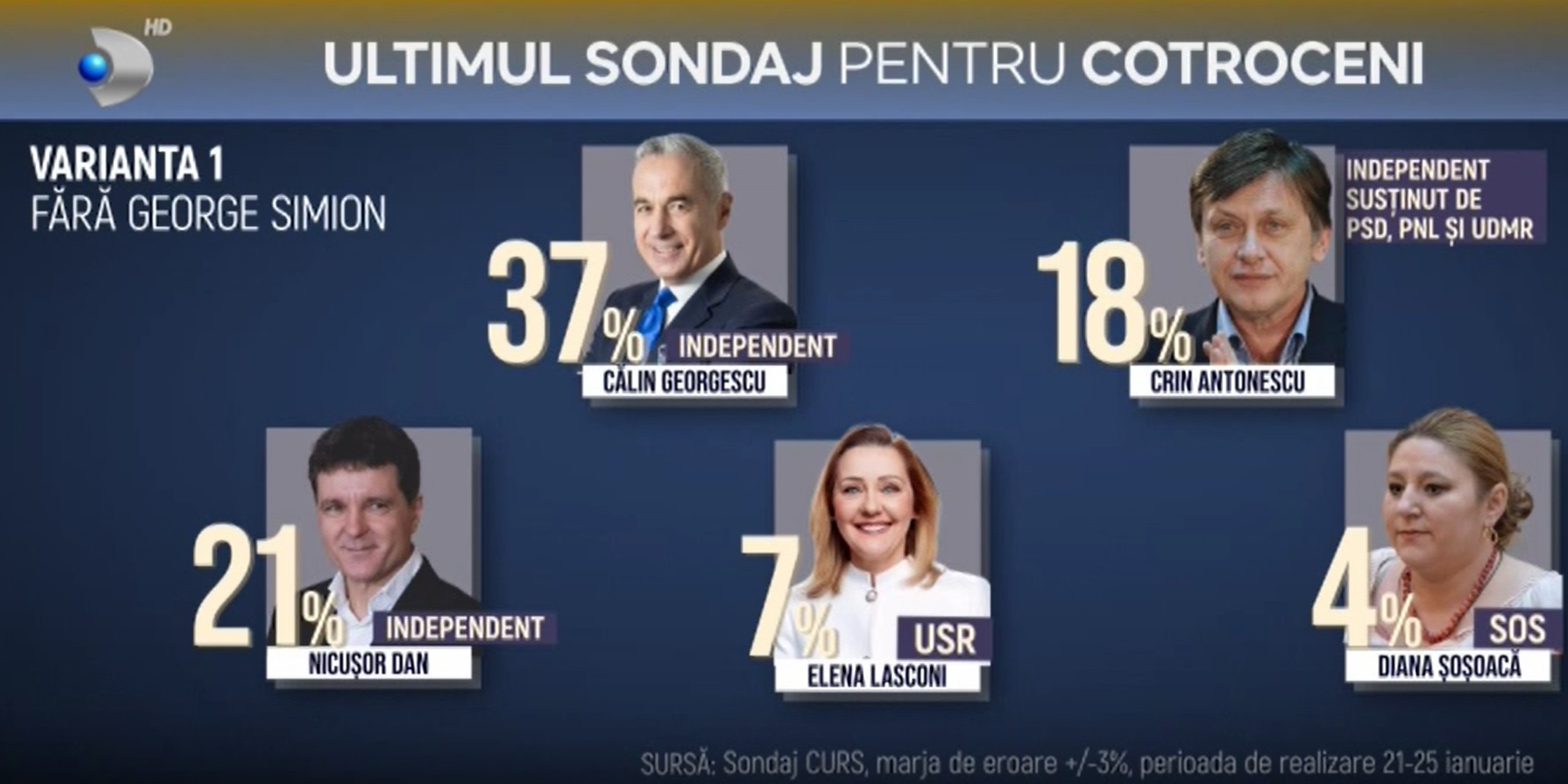 „Nicușor Dan ar ajunge în finala prezidențială împreună cu un candidat susținut de suveraniști dacă mâine ar avea loc alegeri. Crin Antonescu, candidatul coaliției de guvernare, nu s-ar califica, iar fosta finalistă, Elena Lasconi, e departe de primele poziții. De altfel, ea s-a întâlnit cu primarul Capitalei pentru discuții pe tema alegerilor, iar Antonescu a fost la guvern, la ședința coaliției”, a spus Cosmin Cernat.