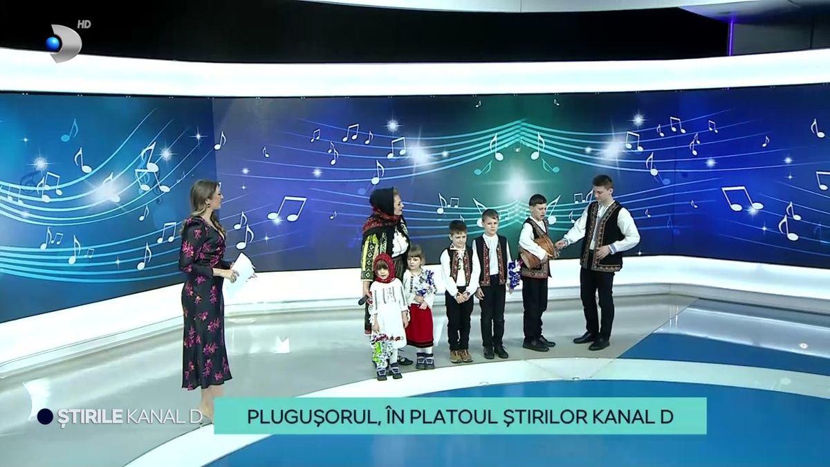 În platoul știrilor au venit acești micuți păstrători ai tradițiilor, însoțiți de solista de muzică populară Cristina Drăgan. Copiii, îmbrăcați în straie populare autentice, ne-au încântat cu plugușorul, un colind tradițional care vestește un an nou cu belșug, pace și frăție.