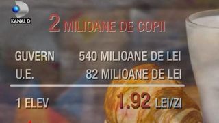 540 de milioane de lei a alocat Guvernul anul acesta pentru hrana a aproape 2 milioane de copii. Uniunea europeana vine si ea cu 82 de milioane de lei, iar la un calcul simplu rezulta ca fiecarui elev ii este alocat aproximativ 1.92 lei pe zi.