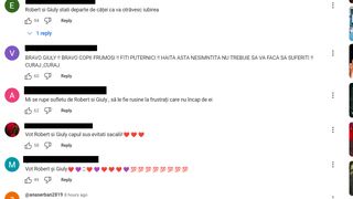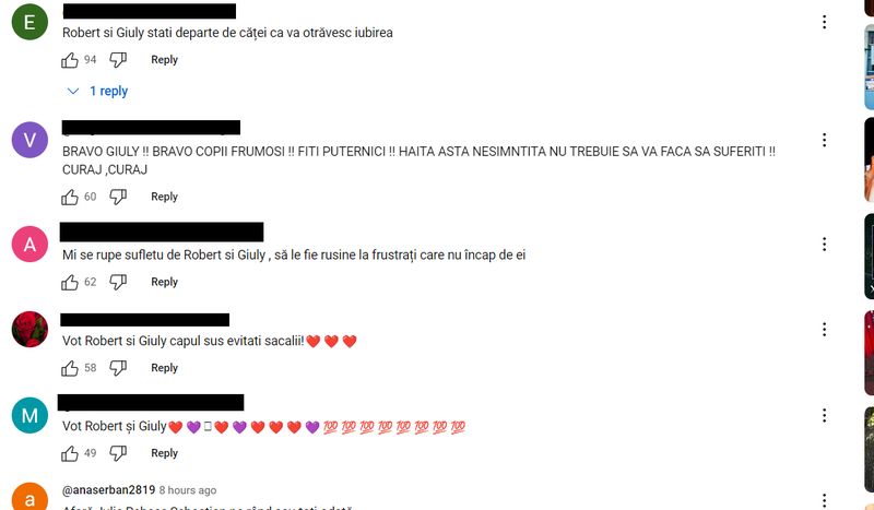 "Vot Robert și Giuly. Capul sus! Evitați șacalii", "Bravo, Giuly! Bravo, copii frumoși! Fiți puternici. Haita asta nesimțită nu trebuie să vă facă să suferiți. Curaj!", "Mi se rupe sufletul de Robert și Giuly. Rușine să le fie frustraților care nu au loc de ei", sunt doar câteva comentarii postate de fanii cuplului pe contul de Youtube al emisiunii Casa Iubirii.