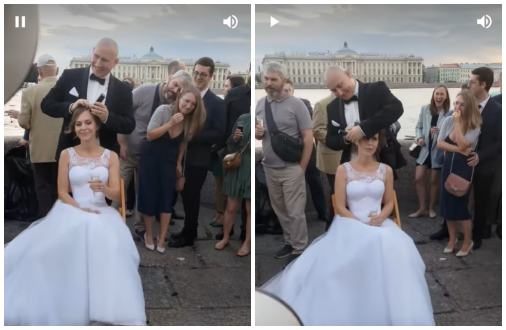 Ce nu se vede în imagini este că și mireasa a făcut același lucru mai devreme: l-a tuns zero pe partenerul ei de viață.