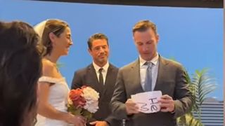 În videoclipul de mai jos, devenit viral pe rețelele sociale, se vede cum mirele se oprește în timpul ceremoniei de nuntă pentru a scoate o hârtie din buzunar.