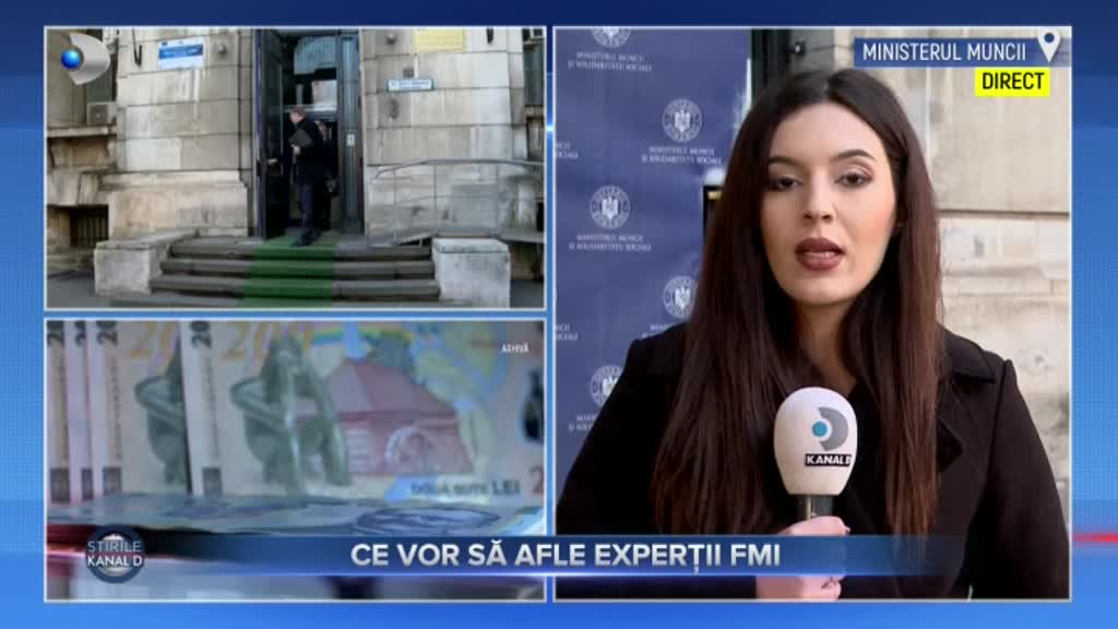 „O delegație a Fondului Monetar Internațional se află într-o misiune de control în țara noastră. Experții veniți au mers în această dimineață la Ministerul Muncii. Colega mea, Diana Buzea, știe exact programul delegației și ni se alătură cu detalii. Bună ziua, Diana”, a transmis Cristina Dorobanțu, prezentatoarea Știrilor Kanal D.